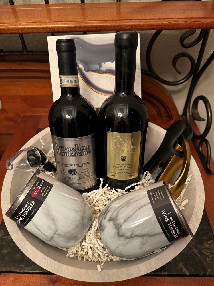 Wine Basket: (2) Bottles Italian Wine, (2) Tumblers, wine corker and wine aerator (1) Brunello di Montalcino: This wine offers an intense red color and body with a delicate bouquet showing elegance and pedigree even before the first sip. Dry with fragrances of ripe fruit and cocoa as well as nuances of violet, leather, and sweet tobacco. Beautifully balanced and structure with bright acidity and strong age-worthy tannins giving way to tangy mineral notes that grace a lingering finish. This wine will continue to unwind and develop as it ages. (1) Regale Golden Label: GRAPE VARIETY 50% Sangiovese Brunello, 50% Cabernet Sauvignon AREA OF PRODUCTION Between municipalities of Pienza and Montepulciano in Tuscany Region DESCRIPTION Deep ruby red in color, the aromas are characterized by a strong varietal expression, with large red fruit, raspberry and licorice. On the palate it is balanced and has a good structure, soft tannins and a lingering finish.