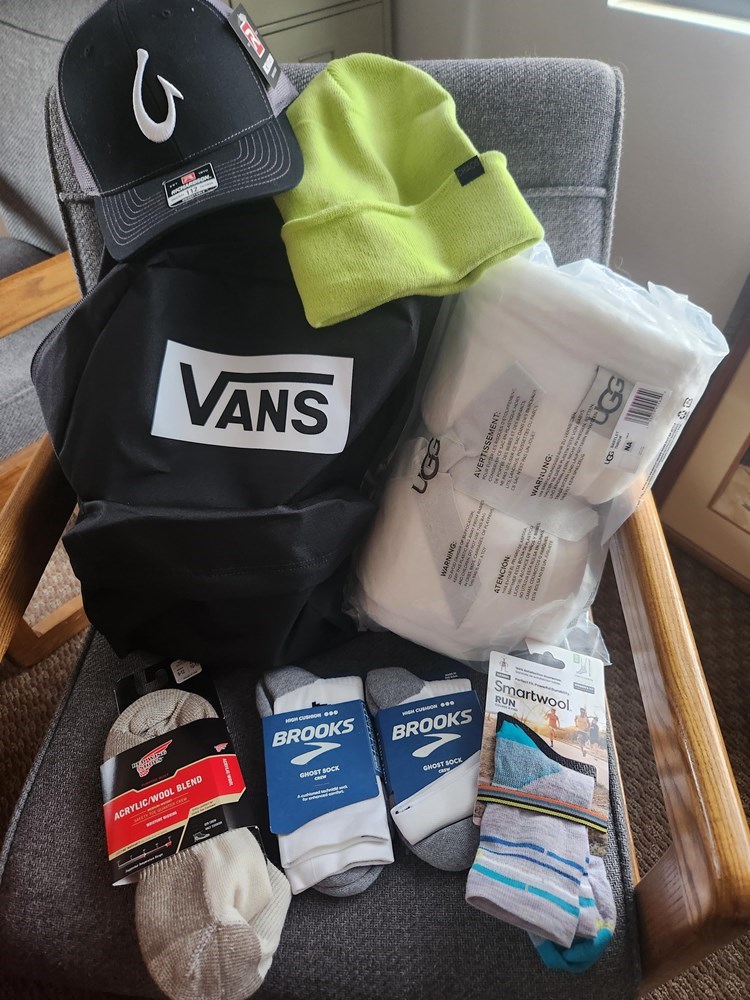 Vans backpack, cap, throw blanket and sock package. Keep your feet cozy while hiking and wrap up in this soft and plush throw on those cool evening this summer. Includes: VANS backpack Beenie hat Baseball/trucker cap UGG brand blanket throw Red Wing Shoes size 9-12 men's quarter crew socks 2 pair Brooks Ghost Sock crew size Large 1 pair Smartwool Run women's socks, size Medium