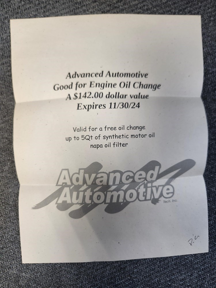 Get your oil changed and be ready for your next trip. Includes: Up to 5 qts of synthetic oil Napa Oil Filter Expires 11/30/2024