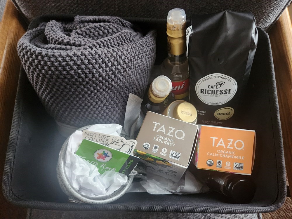 Enjoy some amazing flavors and wrap up on those cool nights with this gift basket provided by Turtle Rock Cafe! Includes: Gray knit blanket Salted Caramel coffee syrup French Vanilla coffee syrup White Chocolate Torani sauce Cafe Richesse House Coffee beans (Ft. Collins, CO) TAZO Earl Grey Tea TAZO Chamomile Tea Rocky Mountain Raw Honey Turtle Rock Coffee & Cafe Gift Card Turtle Rock Coffee Mug