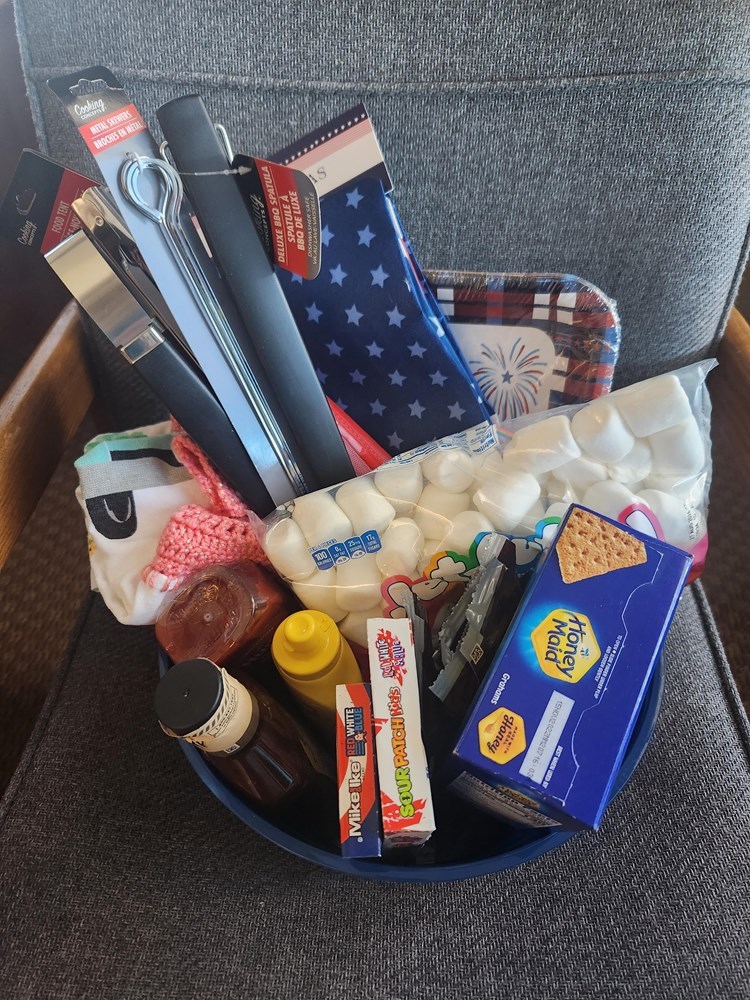 Take this basket out on your Fourth of July camping trip this summer and enjoy s'mores, condiments and some brand new grilling utensils! Includes: Patriotic Bandanas Paper plates S'mores fixings (marshmallows, graham crackers, chocolate) 2 boxes of Patriotic candy (Sourpatch Kids and Mike and Ike) BBQ Sauce Ketchup Mustard 2 Kitchen Towels Utensils (Skewers, 2 sets of tongs, spatula, food tent)