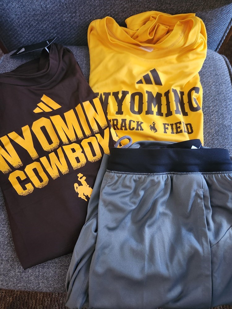 Wyoming Cowboys branded men's athletic wear set. Includes: Adidas Dry fit yellow short sleeve shirt, size Large Adidas brown short sleeve shirt, size Large Adidas Tech shorts, size Medium