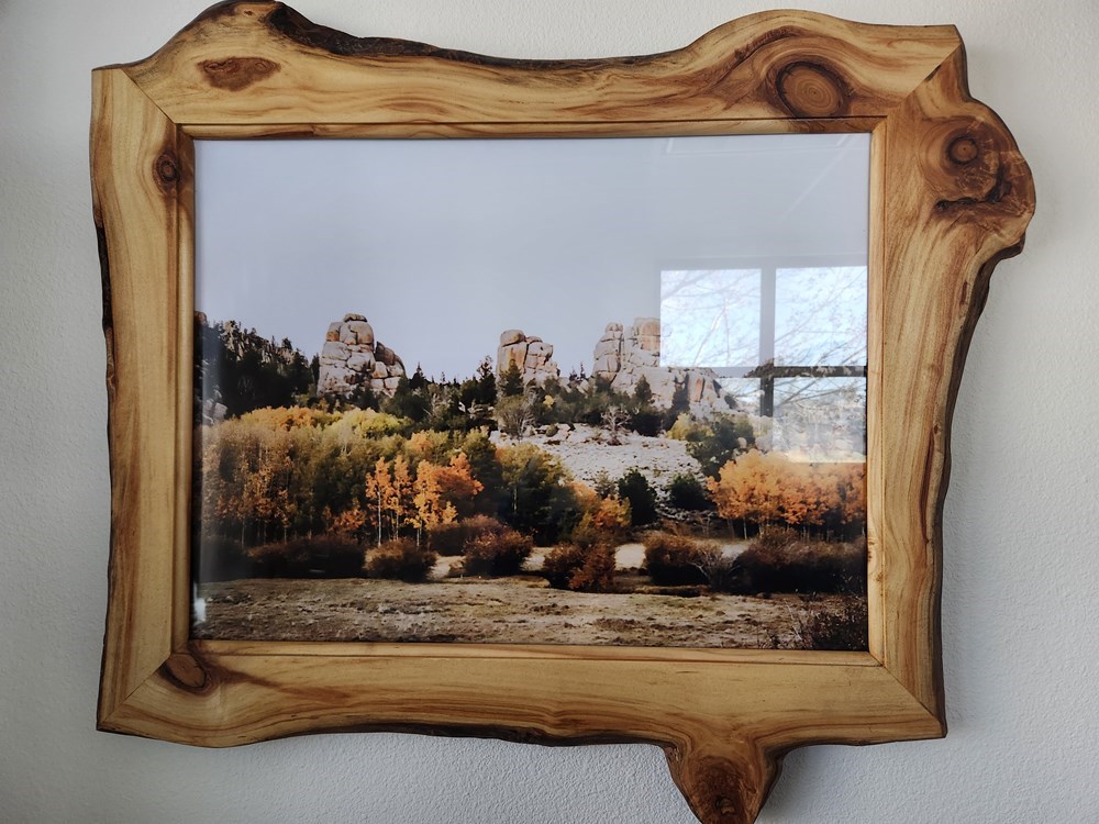 Hang this beautiful live edge frame as is with the Vedauwoo photo or add your own print to the frame! Glass donated by Cowboy Glass.